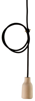 Upphäng i trä (björk) med textilomspunnen svart sladd som är 3 meter lång. Justerbar med läderrem och sprint i mässing.