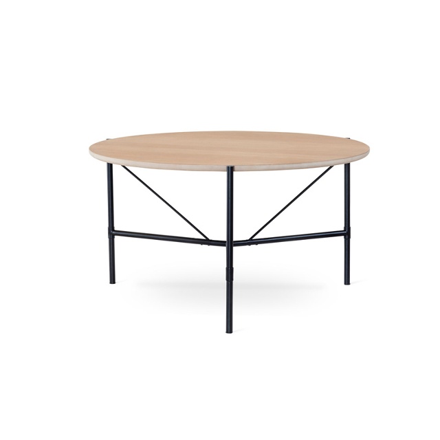 ALE runt matbord har en bordsskivan i fanerad vitoljad ek som kombineras med ett underrede i svart pulverlackad metall.