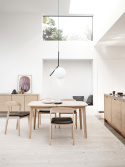 Matbord SM118 är ett rektangulärt bord med mjuka hörn och klassiskt underrede i trä. Benen på SM118 är något vinklade utåt och har raka linjer men samtidigt mjuka rundade former.