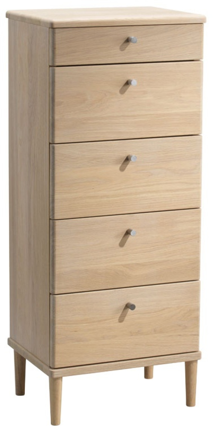 Byrån finns att välja i två olika höjder och har mjukt rundade detaljer med knoppar i stål.