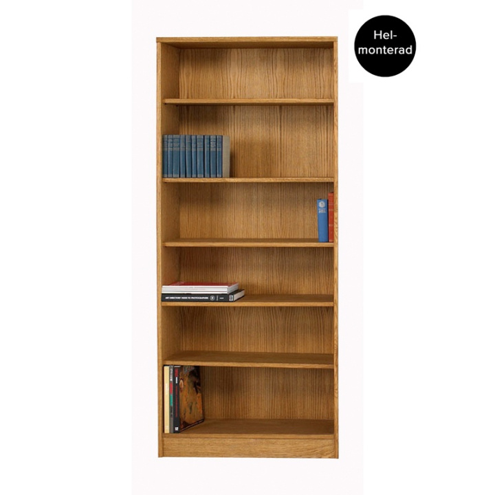 Ekliden byggbar sektionsbokhylla i fanerad oljad ek. E8 är en bred öppen hylla med fem trähyllplan i oljad ek.