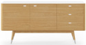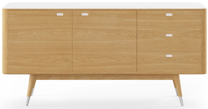 AK2630 är en vacker och praktisk skänk tillverkad i Danmark av Naver Collection. På toppen ligger en vit skiva av det robusta och eleganta materialet Corian vilket gör att du kan placera exempelvis dricksglas och vaser utan att behöva oroa dig för fläckar. De spetsiga träbenen ger skänken ett lätt och svävande utseende. Detaljer som handtag med inlägg i Corian förhöjer känslan av hantverk och kvalitet ytterligare.