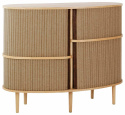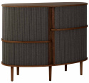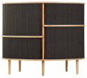 Audacious highboard är ett mångsidigt skåp designat för olika utrymmen, inklusive vardagsrummet, och erbjuder gott om förvaringslösningar. Designen kombinerar en nordisk estetik med djärva element, med jalusidörrar i tyg som framkallar en blandning av nostalgi och modernitet.