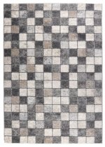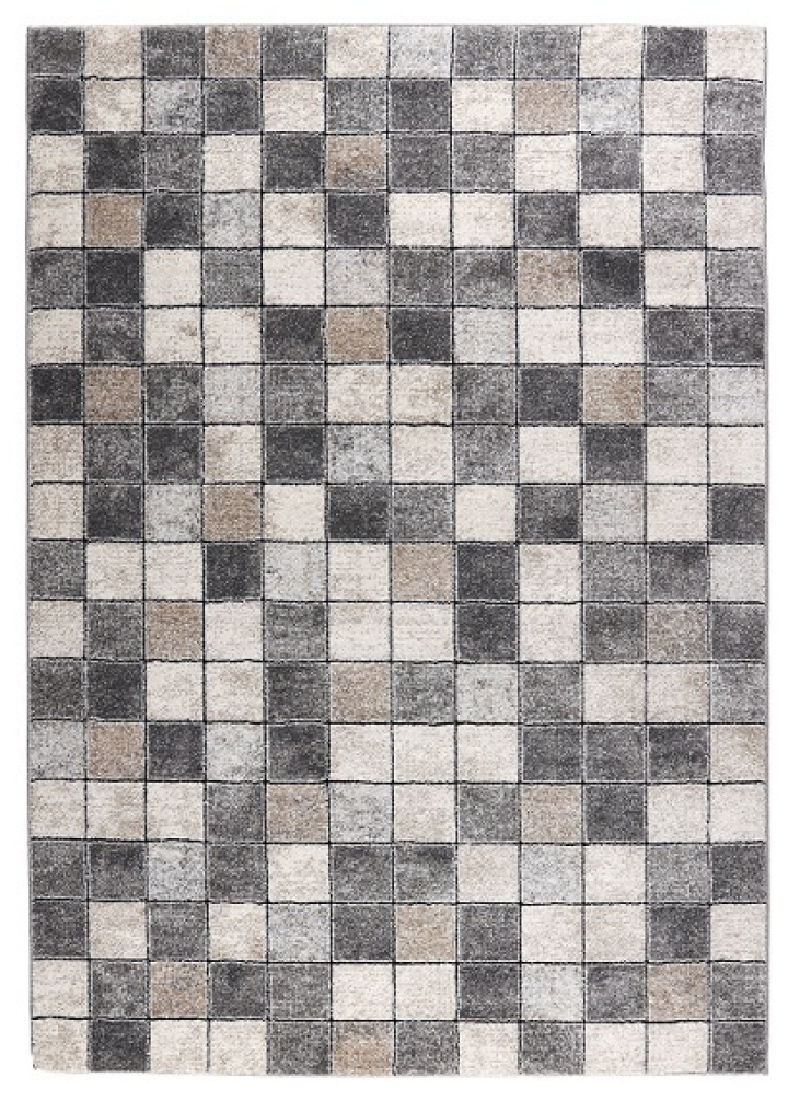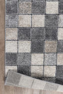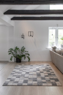 Husvik är en lättskött maskinvävd matta med ett rutigt mönster. Mönstret har melerat grå och beige rutor i en mjuk färgskala. En svart tunn ram runt varje ruta ger mönstret en fin konstrast. Kanten är sydd med ett garn i en ljust grå färg.