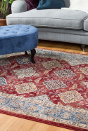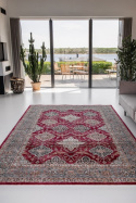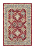 Klassisk wiltonmatta med ett vackert orientaliskt mönster. Mattan är en high quality wilton, en av våra finaste kvaliteter med tät lugg som känns tjock och härligt mjuk. Mönstret har hämtat sin inspiration från orientaliska äkta mattor och har ett stilfullt, tidlöst uttryck. Bottenfärgen är varmt, melerat röd med ett medaljongmönster i guldiga, beige och blå toner. Runtom mattans löper en ram i blått som pryds av ett fint mönster i guldiga toner. Den yttersta kanten pryds av en ram i rött.