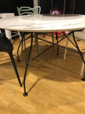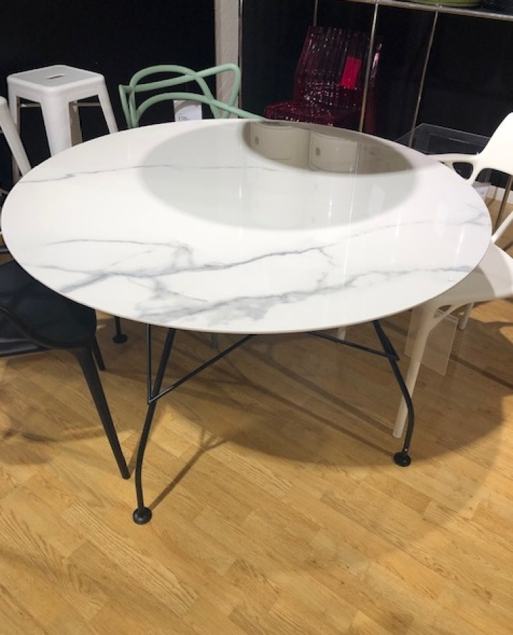 Glossy är ett bord som är tillverkat av kartell. Runt matbord med konstmarmor och ett stativ i svart metall.