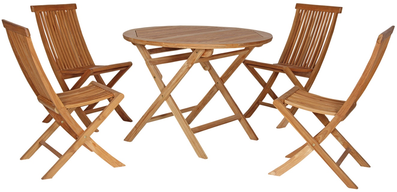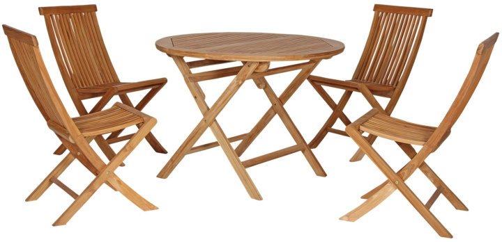 Klassisk teakgrupp med runt bord med diametern 100 cm samt fyra ihopfällbara stolar.