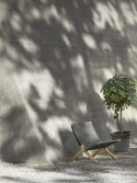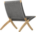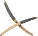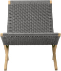Uteversionen tillverkas i massiv obehandlad teak med grafitgrått flatvävt rep för utebruk.