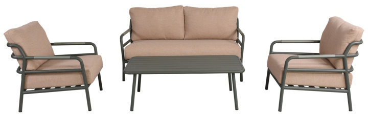 Pipe är en modern och stilren soffgrupp i pulverlackad grön aluminium kombinerat med dynor i vädertåligt olefintyg. Med mjuka vinklar och rundade hörn får soffgruppen ett elegant uttryck. Soffgruppen består av 2-sits soffa, 2 st fåtöljer samt ett bord.