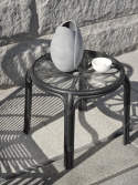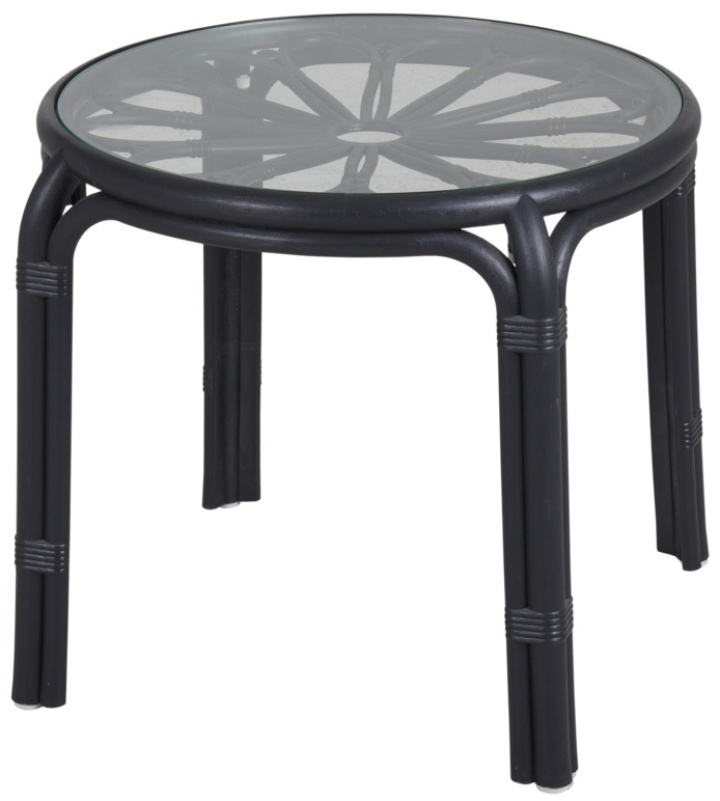 Ett lagom stort sidobord i klassiskt lekfullt rottingutförande, men i stabil och tålig plast. Skiva i glas.