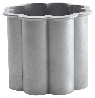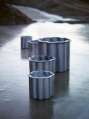 Utekrukor för växter har intresserat mig lika länge som mitt intresse för trädgård. Som keramiker har jag gjort många olika former både i lergods och stengods. Trots hål i botten och fötter undertill har de aldrig motstått den svenska vintern, utan spruckit i botten. Nu har jag funnit det optimala materialet – sandgjuten aluminium. Jag kallar dem Gråsippa efter den mjuka blomformen. Den avslutande kragen gör de mindre storlekarna lätta att flytta. Den stora blir nog kvar där man ställer den – å andra sidan rymmer den ett helt träd.
